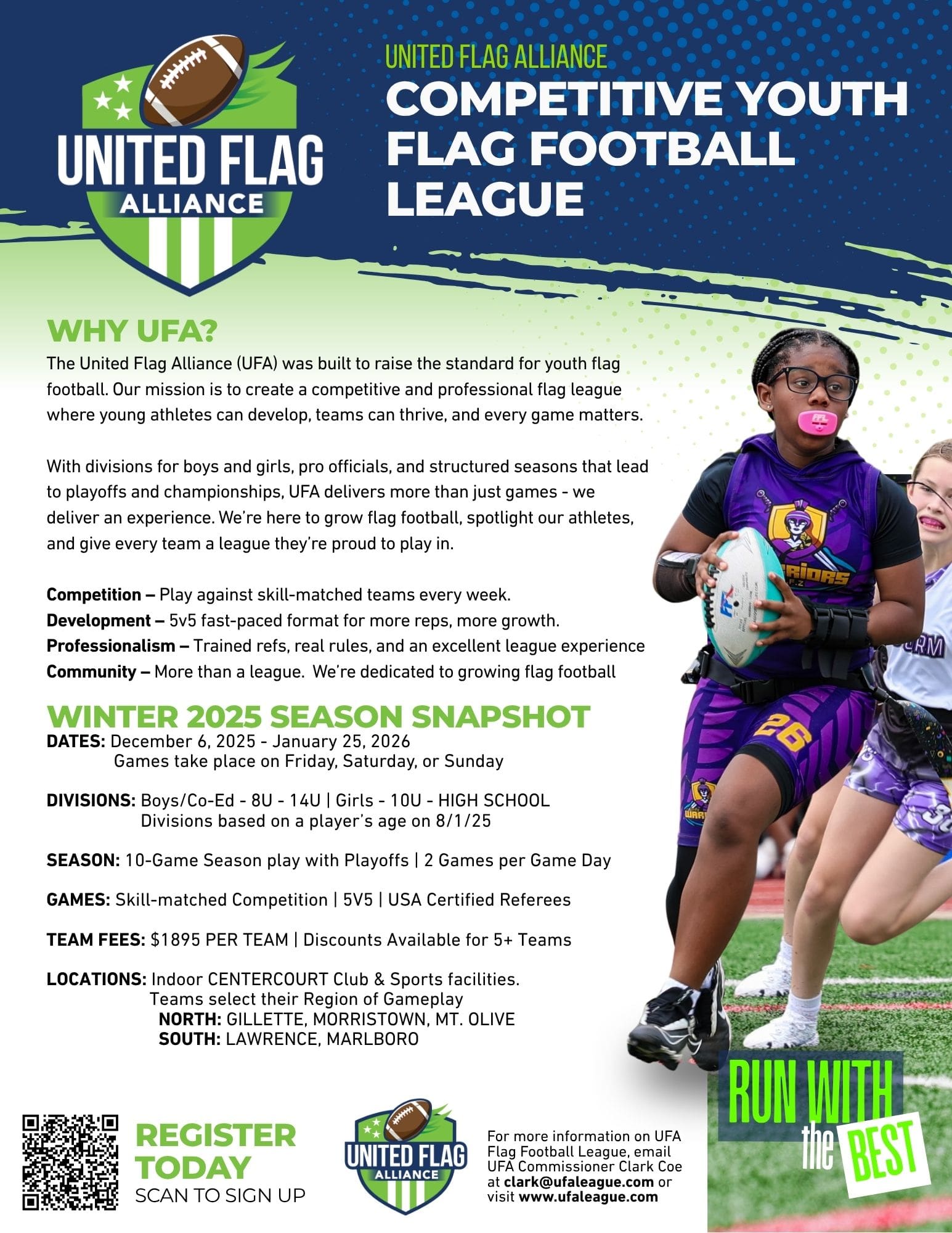 United Flag Alliance offers the opportunity for local town and travel programs to play in organized, competitive, and conveniently located games on a weekly basis against teams from other towns in your area. UFA creates each team’s schedule, assign and pay referees weekly, provide media coverage, coordinate playoffs and championship series, and provide live updates weekly. UFA is a one-stop shop - just show up and play!